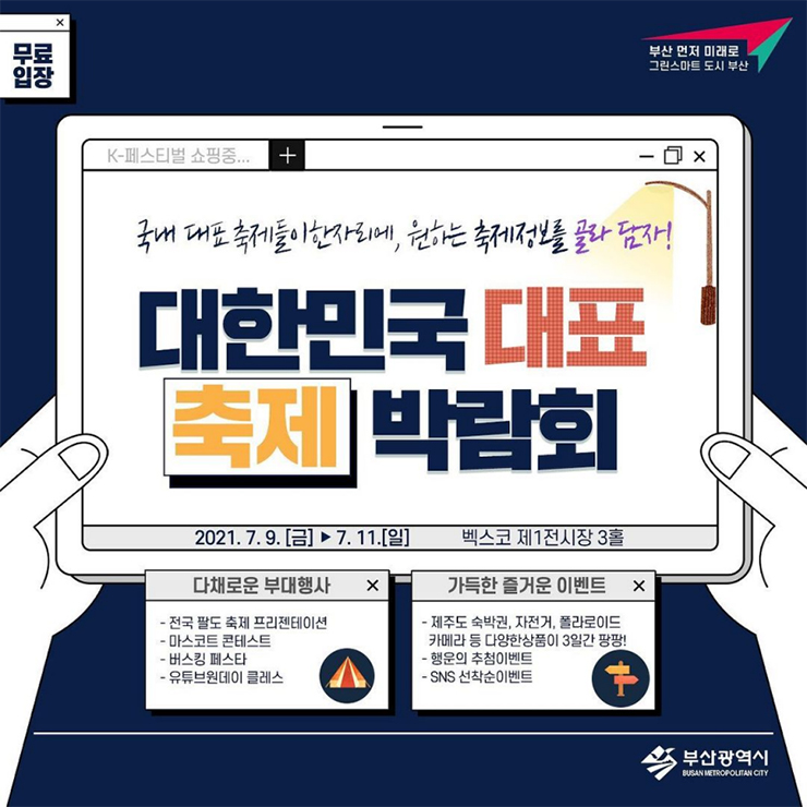 하나. 7월 9일 ~ 7월 11일 벡스코에 간다. 둘. 대한민국 대표 축제 박람회에 무료로 입장한다. 셋. 전국의 대표 축제들을 하나도 빠짐없이 야무지게 체험한다. ✅기간 : 2021. 7. 9(금) ~ 7. 11(일) ✅장소 : 부산 벡스코 제1전시장 3홀 ✅요금 : 무료입장 + 자세한 내용은 '대한민국 대표 축제 박람회' 홈페이지를 참고해 주세요! ☎문의 02-3785-3905 (대한민국 대표 축제박람회 사무국) 다채로운 부대행사 - 전국 팔도 축제 프리젠테이션 - 마스코트 콘테스트 - 버스킹 페스타 - 유튜브원데이 클레스 가득한 즐거운 이벤트 - 제주도 숙박권, 자전거, 폴라로이드 카메라 등 다양한 상품이 3일간 팡팡! - 행운의 추첨이벤트 - SNS 선착순이벤트 ㅣ ![]() 출처 : 부산광역시 공식 인스타그램 People who like this sort of thing will find this the sort of thing they like.