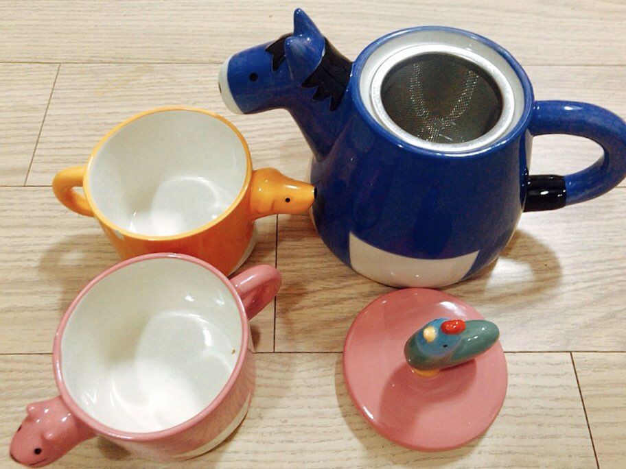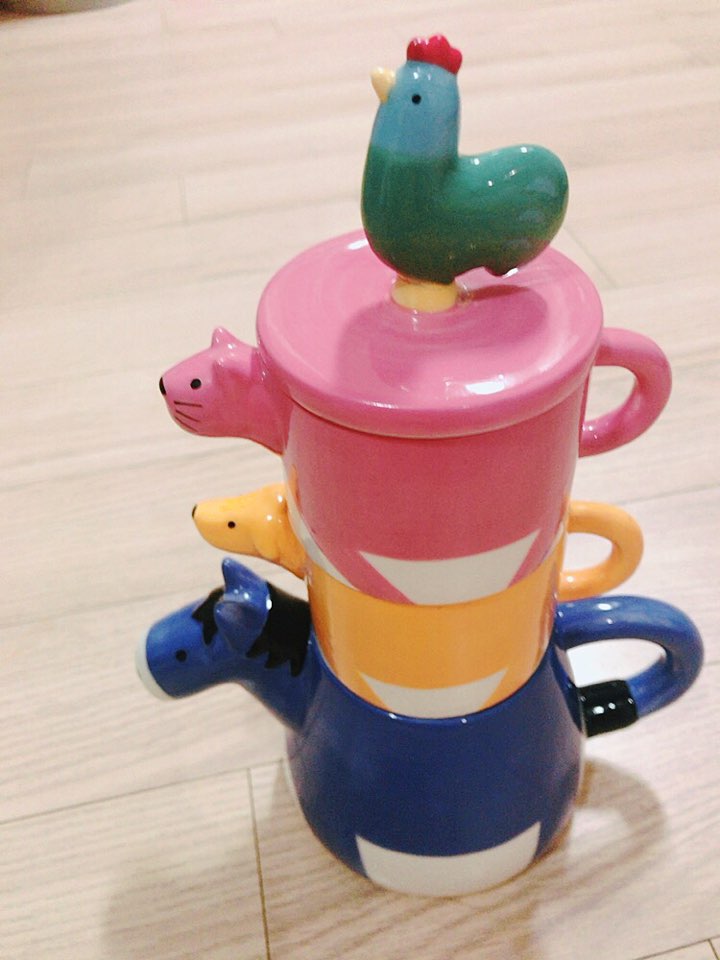 주전자 위에 찻잔두개가 브레멘음악대 모양으로 올라가 있어요